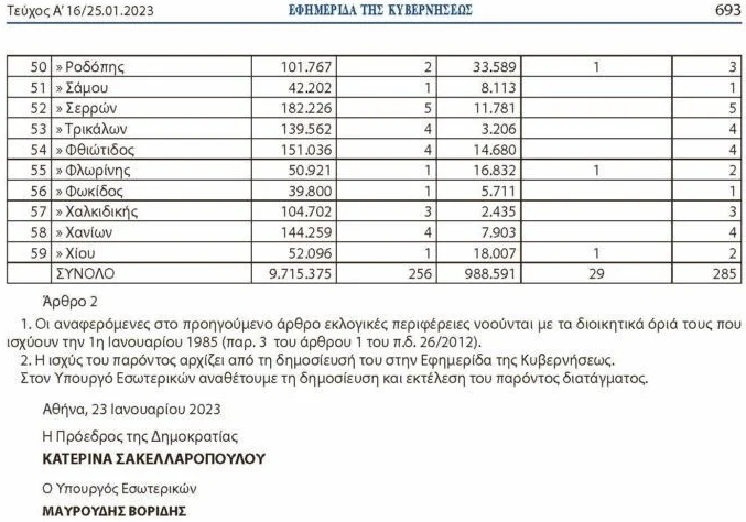 Σε συνέχεια των απαραίτητων διαδικασιών ενόψει εκλογών, εκδόθηκε το βράδυ της Τετάρτης το σχετικό Προεδρικό Διάταγμα με το οποίο καθορίζονται οι βουλευτικές έδρες κάθε εκλογικής περιφέρειας για τις βουλευτικές εκλογές του 2023.