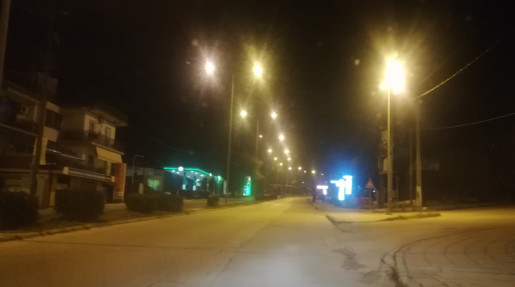 Μία ώρα πριν από το «κλείσιμο» των 9 το βράδυ της Κυριακής και την πόλη την έχει ζώσει το σκοτάδι, η σιωπή και η μοναχικότητα.