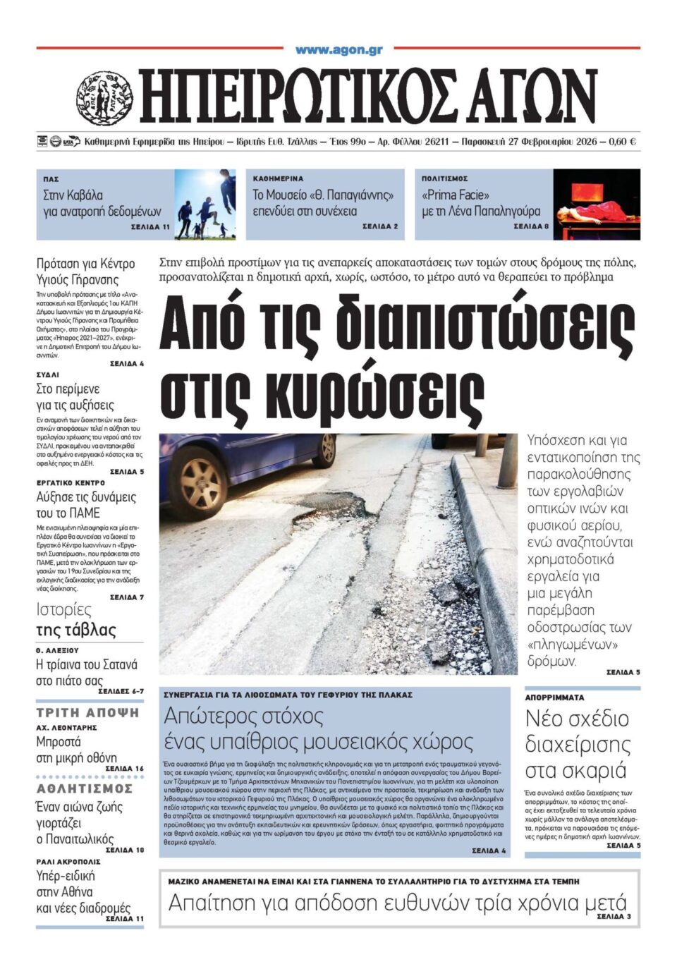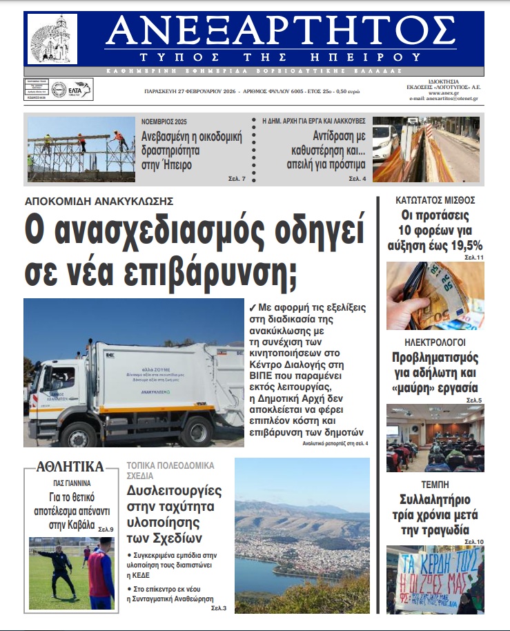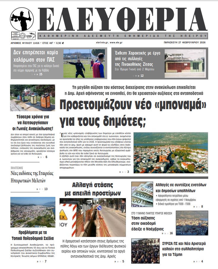 ΑρχικήTOP STORIES TOP STORIESΗΠΕΙΡΟΣ Τα πρωτοσέλιδα των γιαννιώτικων εφημερίδων 27.02.2026 0 FacebookTwitterWhatsAppEmailΤυπώνωViber Διαβάστε στα πρωτοσέλιδα των γιαννιώτικων εφημερίδων Παρασκευή 27-2-2026 TagsΓΙΑΝΝΙΩΤΙΚΕΣ ΕΦΗΜΕΡΙΔΕΣΕΦΗΜΕΡΙΔΕΣΠΡΩΤΟΣΕΛΙΔΑ FacebookTwitterWhatsAppEmailΤυπώνωViber Προηγούμενο άρθροΕΟΔΥ -Τέσσερις νέοι θάνατοι από κορωνοϊό και τρεις από γρίπηΕπόμενο άρθροΤΑ ΤΟΥ ΚΑΙΣΑΡΟΣ… ΣΧΕΤΙΚΑ ΑΡΘΡΑ Τα πρωτοσέλιδα των γιαννιώτικων εφημερίδων ΗΠΕΙΡΟΣ 26.02.2026 Τα πρωτοσέλιδα των γιαννιώτικων εφημερίδων ΗΠΕΙΡΟΣ 25.02.2026 Τα πρωτοσέλιδα των γιαννιώτικων εφημερίδων ΗΠΕΙΡΟΣ 20.02.2026 Τα πρωτοσέλιδα των γιαννιώτικων εφημερίδων ΗΠΕΙΡΟΣ 19.02.2026 Τα πρωτοσέλιδα των γιαννιώτικων εφημερίδων ΗΠΕΙΡΟΣ 18.02.2026 Τα πρωτοσέλιδα των γιαννιώτικων εφημερίδων ΗΠΕΙΡΟΣ 17.02.2026 ΣΤΗΝ ΙΔΙΑ ΚΑΤΗΓΟΡΙΑ Ιωάννινα: Μαθητές και φοιτητές στους δρόμους για την επέτειο της τραγωδίας των Τεμπών ΗΠΕΙΡΟΣ 27.02.2026 …χωρίς προϋπολογισμό και προμήθεια υλικών πως θα κλείσουν οι λακκούβες ; ΗΠΕΙΡΟΣ 27.02.2026 Τέσσερα χρόνια για να λειτουργήσουν οι Γωνιές Ανακύκλωσης! ΗΠΕΙΡΟΣ 27.02.2026 ΗΓΟΥΜΕΝΙΤΣΑ -Συνελήφθη με 288 πακέτα λαθραίων τσιγάρων ΗΠΕΙΡΟΣ 26.02.2026 Αλλαγή στάσης με απειλή προστίμων ΗΠΕΙΡΟΣ 26.02.2026 Προετοιμάζουν νέο «μποναμά» για τους δημότες; ΗΠΕΙΡΟΣ 26.02.2026 ΜΗ ΧΑΣΕΤΕ …χωρίς προϋπολογισμό και προμήθεια υλικών πως θα κλείσουν οι λακκούβες ; Τέσσερα χρόνια για να λειτουργήσουν οι Γωνιές Ανακύκλωσης! Ανθεί η «μαύρη εργασία» στους ηλεκτρολόγους Αλλαγή στάσης με απειλή προστίμων Μόνον ένοχοι υπάρχουν για την τάφρο Λαψίστας ΔΗΜΟΦΙΛΗ ΤΑ ΤΟΥ ΚΑΙΣΑΡΟΣ… Δεν επιτρέπεται καμία χαλάρωση στον ΠΑΣ Τέσσερα χρόνια για να λειτουργήσουν οι Γωνιές Ανακύκλωσης! …χωρίς προϋπολογισμό και προμήθεια υλικών πως θα κλείσουν οι λακκούβες ; Ανθεί η «μαύρη εργασία» στους ηλεκτρολόγους