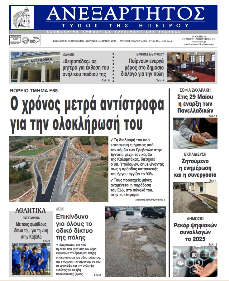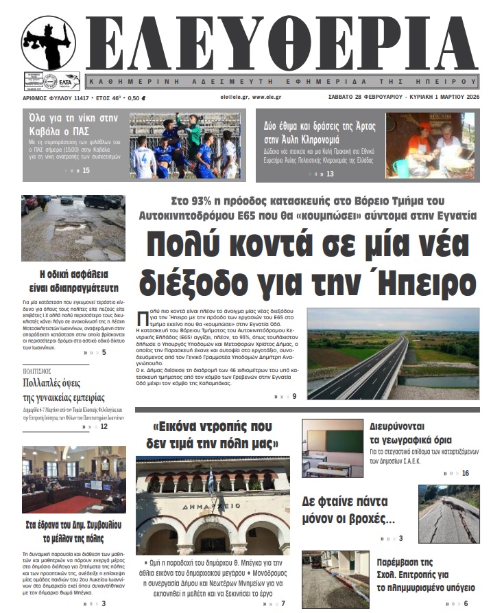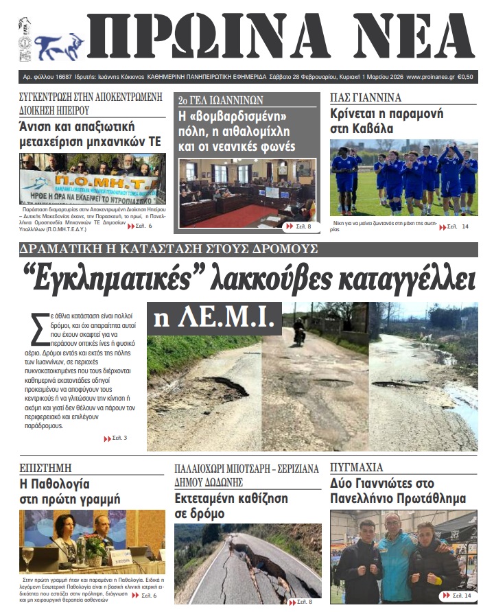 ΑρχικήTOP STORIES TOP STORIESΗΠΕΙΡΟΣ Τα πρωτοσέλιδα των γιαννιώτικων εφημερίδων 28.02.2026 0 FacebookTwitterWhatsAppEmailΤυπώνωViber Διαβάστε στα πρωτοσέλιδα των γιαννιώτικων εφημερίδων Σάββατο 28-2-2026 TagsΓΙΑΝΝΙΩΤΙΚΕΣ ΕΦΗΜΕΡΙΔΕΣΕΦΗΜΕΡΙΔΕΣΠΡΩΤΟΣΕΛΙΔΑ FacebookTwitterWhatsAppEmailΤυπώνωViber Προηγούμενο άρθροΌλα για τη νίκη στην Καβάλα ο ΠΑΣΕπόμενο άρθροΤΑ ΤΟΥ ΚΑΙΣΑΡΟΣ… ΣΧΕΤΙΚΑ ΑΡΘΡΑ Τα πρωτοσέλιδα των γιαννιώτικων εφημερίδων ΗΠΕΙΡΟΣ 27.02.2026 Τα πρωτοσέλιδα των γιαννιώτικων εφημερίδων ΗΠΕΙΡΟΣ 26.02.2026 Τα πρωτοσέλιδα των γιαννιώτικων εφημερίδων ΗΠΕΙΡΟΣ 25.02.2026 Τα πρωτοσέλιδα των γιαννιώτικων εφημερίδων ΗΠΕΙΡΟΣ 20.02.2026 Τα πρωτοσέλιδα των γιαννιώτικων εφημερίδων ΗΠΕΙΡΟΣ 19.02.2026 Τα πρωτοσέλιδα των γιαννιώτικων εφημερίδων ΗΠΕΙΡΟΣ 18.02.2026 ΣΤΗΝ ΙΔΙΑ ΚΑΤΗΓΟΡΙΑ Τρία χρόνια μετά κανείς δεν ξεχνά ΗΠΕΙΡΟΣ 28.02.2026 «Εικόνα ντροπής που δεν τιμά την πόλη μας» ΗΠΕΙΡΟΣ 28.02.2026 Στα έδρανα του Δημοτικού Συμβουλίου το μέλλον της πόλης ΗΠΕΙΡΟΣ 28.02.2026 Στο επίκεντρο η προστασία της Παμβώτιδας και η αναβάθμιση του μονοπατιού προς τη Μονή Στομίου ΗΠΕΙΡΟΣ 28.02.2026 Παρέμβαση της Σχολικής Επιτροπής για το πλημμυρισμένο υπόγειο ΗΠΕΙΡΟΣ 27.02.2026 «Ακατανόητη» πινακίδα αποσύρθηκε μετά την παρέμβαση της Ε’ ΚΟΗ ΗΠΕΙΡΟΣ 27.02.2026 ΜΗ ΧΑΣΕΤΕ Τρία χρόνια μετά κανείς δεν ξεχνά «Εικόνα ντροπής που δεν τιμά την πόλη μας» «Θα θρηνήσουμε θύματα με τις λακκούβες στην πόλη» Δε φταίνε πάντα μόνον οι βροχές… Τέσσερα χρόνια για να λειτουργήσουν οι Γωνιές Ανακύκλωσης! ΔΗΜΟΦΙΛΗ «Εικόνα ντροπής που δεν τιμά την πόλη μας» Στο επίκεντρο η προστασία της Παμβώτιδας και η αναβάθμιση του μονοπατιού προς τη Μονή Στομίου ΠΕΑΚΙ -Ανοιχτή για το κοινό η χωμάτινη διαδρομή στο Πανηπειρωτικό Όλα για τη νίκη στην Καβάλα ο ΠΑΣ «ΚΙΝΟΥΜΑΙ ΗΛΕΚΤΡΙΚΑ» -Αύξηση προϋπολογισμού και παράταση