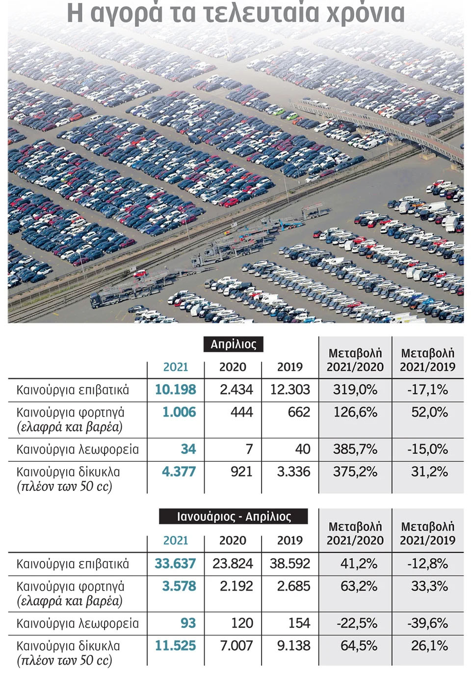 Με βάση τα πρωτογενή στοιχεία της ΕΛΣΤΑΤ και την επεξεργασία του Συνδέσμου Εισαγωγέων Αντιπροσώπων Αυτοκινήτων (ΣΕΑΑ), οι ταξινομήσεις για τον μήνα Απρίλιο εκτοξεύθηκαν κατά 319% σε σχέση με τον αντίστοιχο μήνα του 2020. Πριν από ένα χρόνο, η πανδημία του κορωνοϊού δημιούργησε μεγάλη ανησυχία στους υποψήφιους αγοραστές νέων αυτοκινήτων.