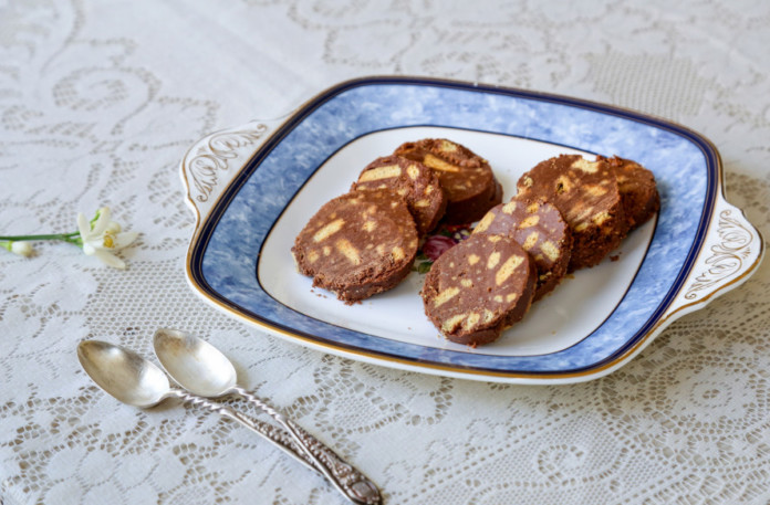 Σε μπεν μαρί ζεσταίνουμε το μέλι μέχρι να γίνει ρευστό. Αποσύρουμε, προσθέτουμε το ταχίνι και ανακατεύουμε μέχρι να ομογενοποιηθεί. Σε μπεν μαρί λιώνουμε την κουβερτούρα και την προσθέτουμε στο μείγμα με το ταχίνι, ρίχνουμε τα μπισκότα, τα δημητριακά και ανακατεύουμε. Ρίχνουμε το μείγμα κατά μήκος μεμβράνης και τυλίγουμε σε ρολό. Το πιάνουμε από τις άκρες και το ρολάρουμε στον πάγκο της κουζίνας μέχρι να πάρει σχήμα στρογγυλό. Τοποθετούμε στο ψυγείο για μια ώρα.