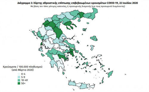 Από το σύνολο των 4077 κρουσμάτων, 1128 (27.7%) θεωρούνται σχετιζόμενα με ταξίδι από το εξωτερικό, 2066 (50.7%) είναι σχετιζόμενα με ήδη γνωστό κρούσμα και τα υπόλοιπα δεν σχετίζονται ούτε με ταξίδι ούτε με άλλο γνωστό κρούσμα ή είναι ακόμα υπό διερεύνηση.