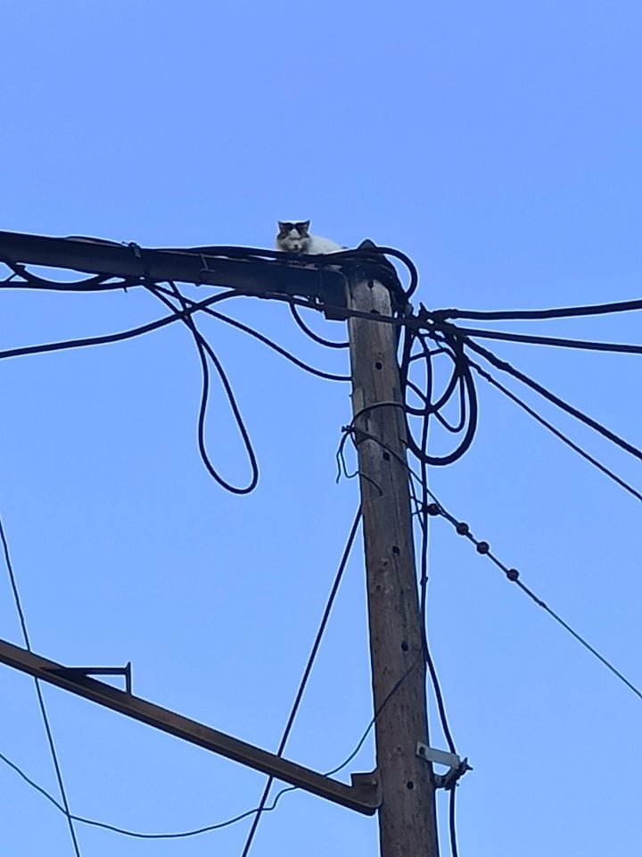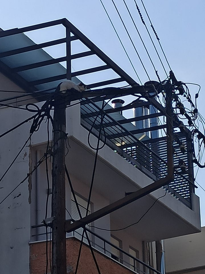 Σε κολώνα της ΔΕΗ βρίσκεται εγκλωβισμένη για πάνω από 15 ώρες μια γάτα. Σύμφωνα με πληροφορίες από τους περίοικους, κλήθηκε η Πυροσβεστική, ωστόσο, εξαιτίας των καλωδίων υψηλής τάσης, πρέπει να προηγηθεί παρέμβαση του ΔΕΔΔΗΕ για να διακοπεί προσωρινά η ηλεκτροδότηση και να γίνει επιχείρηση διάσωσης.
